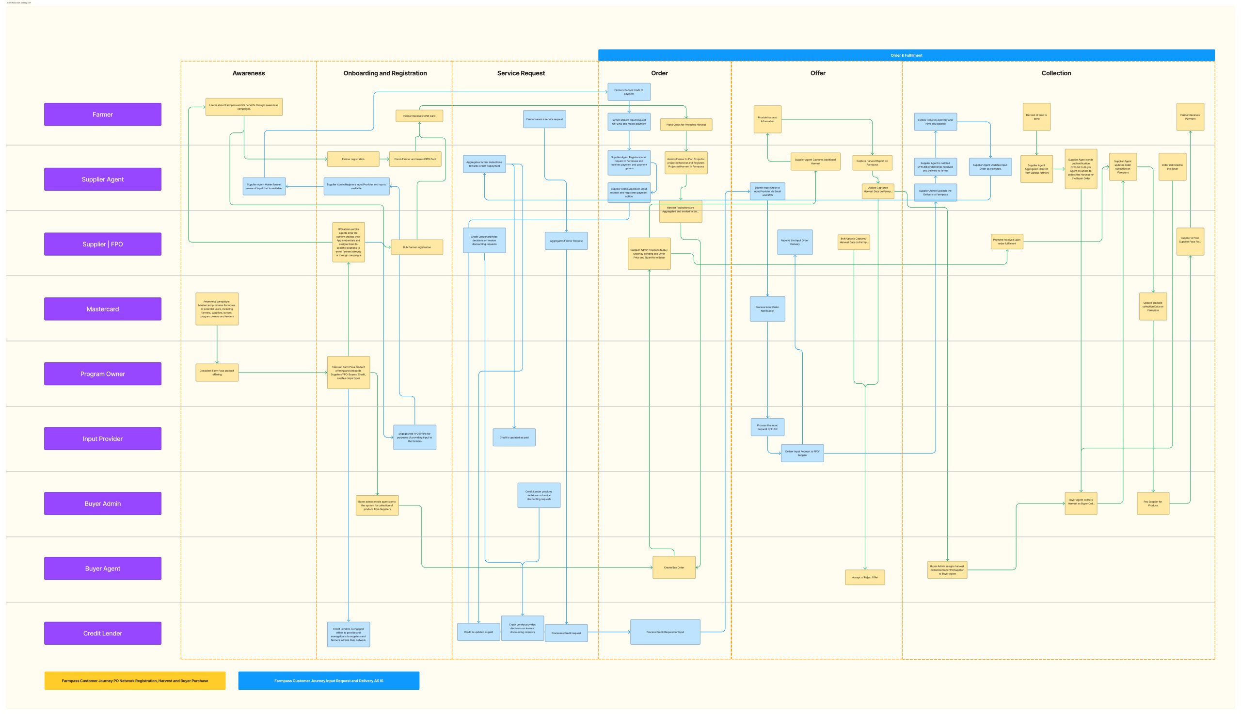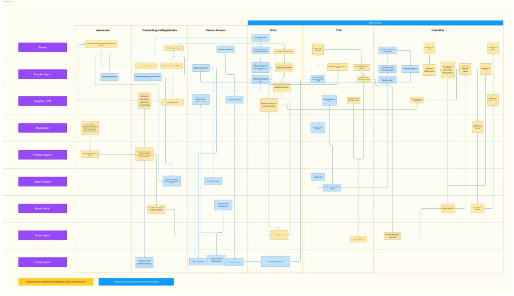 In addition to user-centred design, I collaborated with the sales team to visualise how Mastercard’s Community Pass (CP) could integrate with existing agricultural finance and payment solutions. These journeys were tailored to demonstrate CP’s business potential, simplifying the registration, onboarding, and transaction workflows.